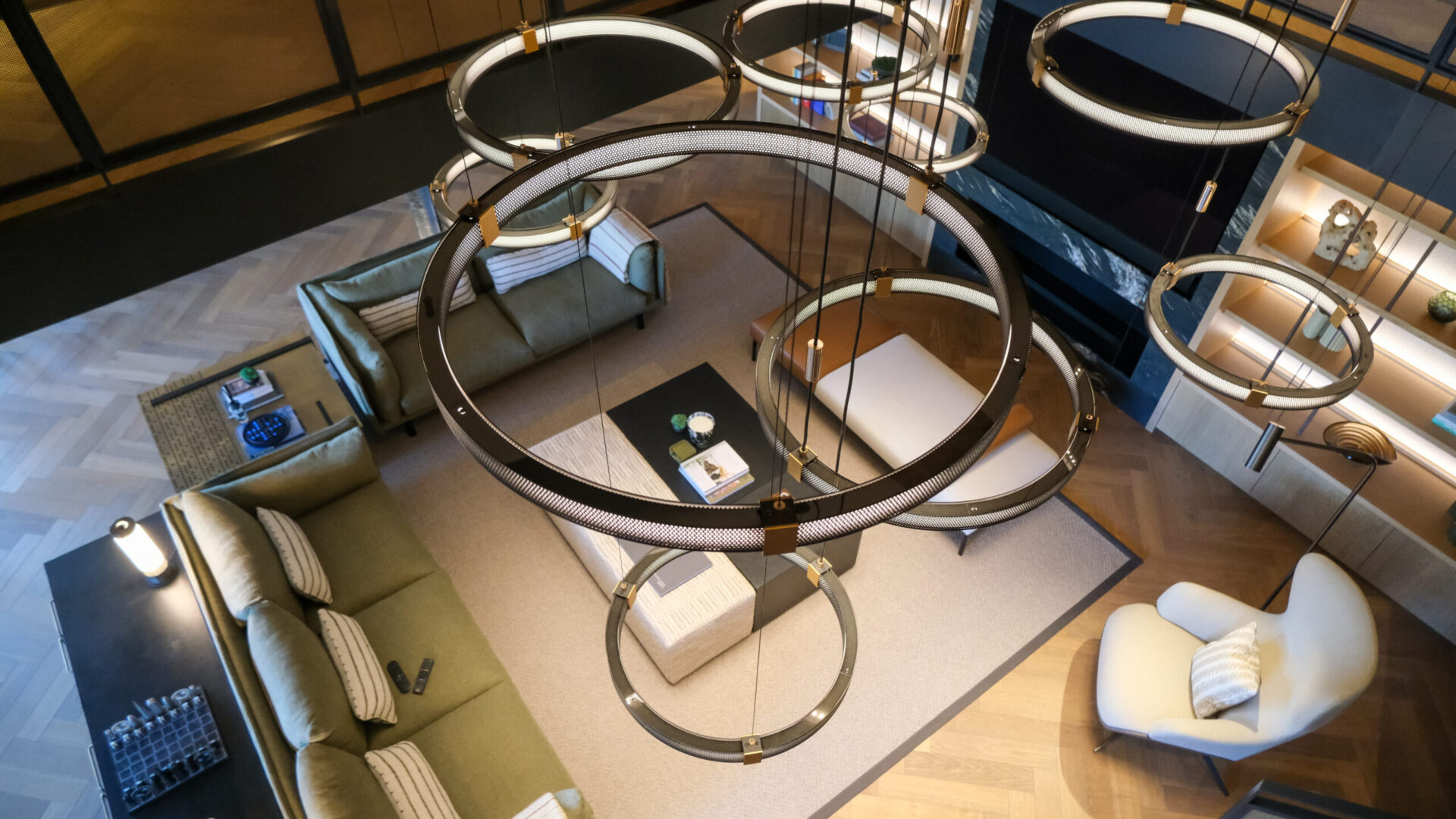 Discreet plaster in (invisible) ceiling speakers were installed in key areas to provide high-fidelity, room-to-room audio with no visual impact The distributed audio system integrates with Control4, allowing residents to manage music across zones with ease.